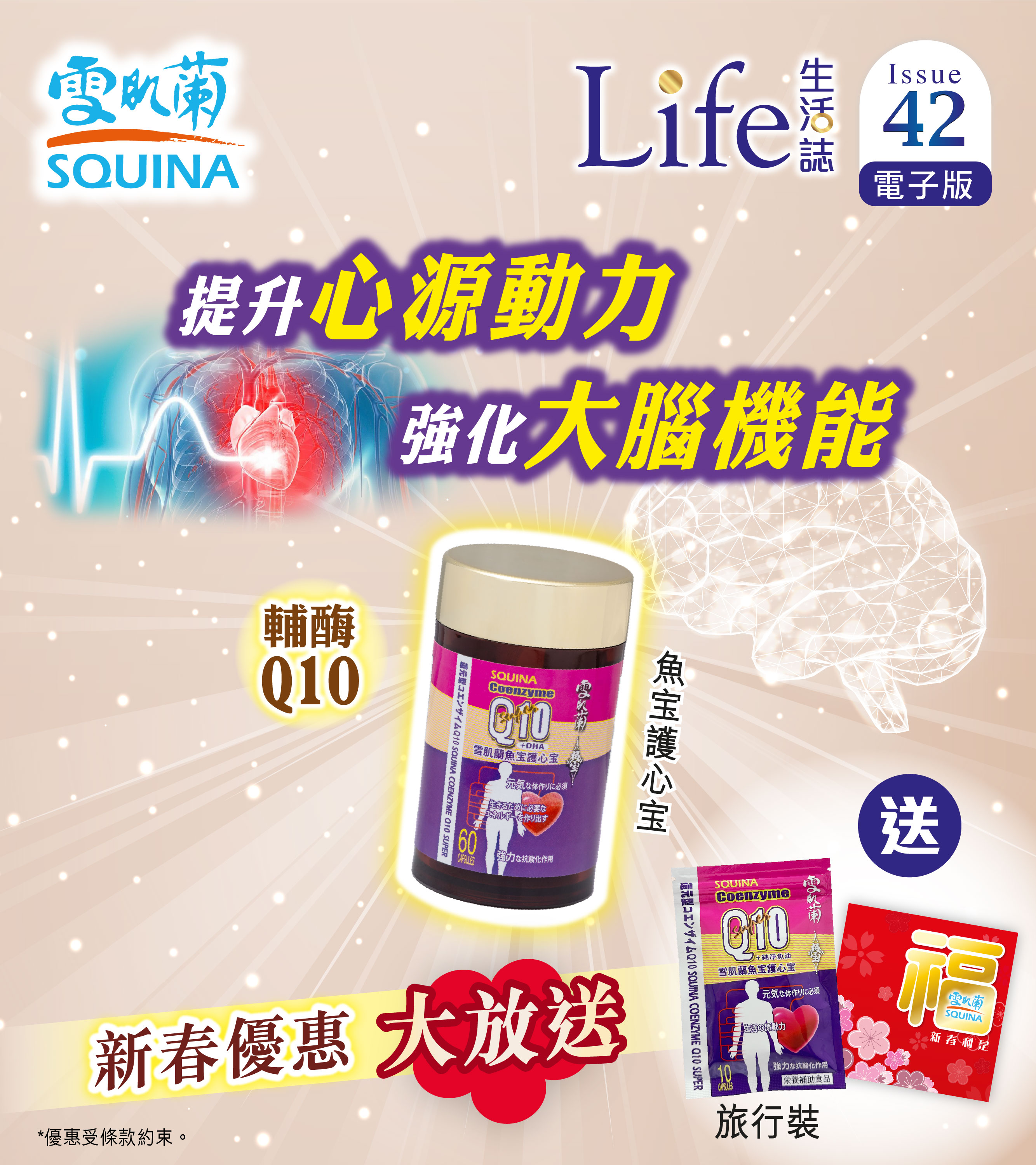 優質輔酶Q10(還元型)+優質魚油精萃配方,專為提升心臟、大腦動力而設計,幫助心、腦血管舒張及維持彈性,支持機能健康,延緩退化;魚油DHA是大腦和視網膜中最豐富的Omega-3脂肪酸,對維持認知功能、記憶力和情緒平衡是至關重要,產生協同效應,為心腦注入雙重活力。