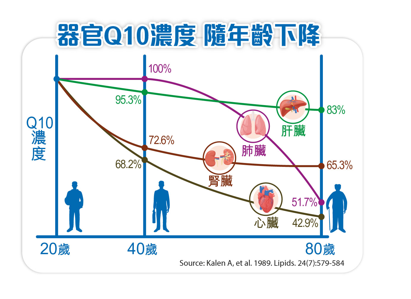 當輔酶Q10充足,代表心臟、腦等器官健壯。反之,輔酶Q10不足,線粒體功能異常,細胞沒法正常運作,導致影響重要器官,誘發健康問題。能量需求愈高的器官,例如心臟、大腦,線粒體及輔酶Q10會愈多。所以輔酶Q10是維持心、腦強壯的關鍵要素。