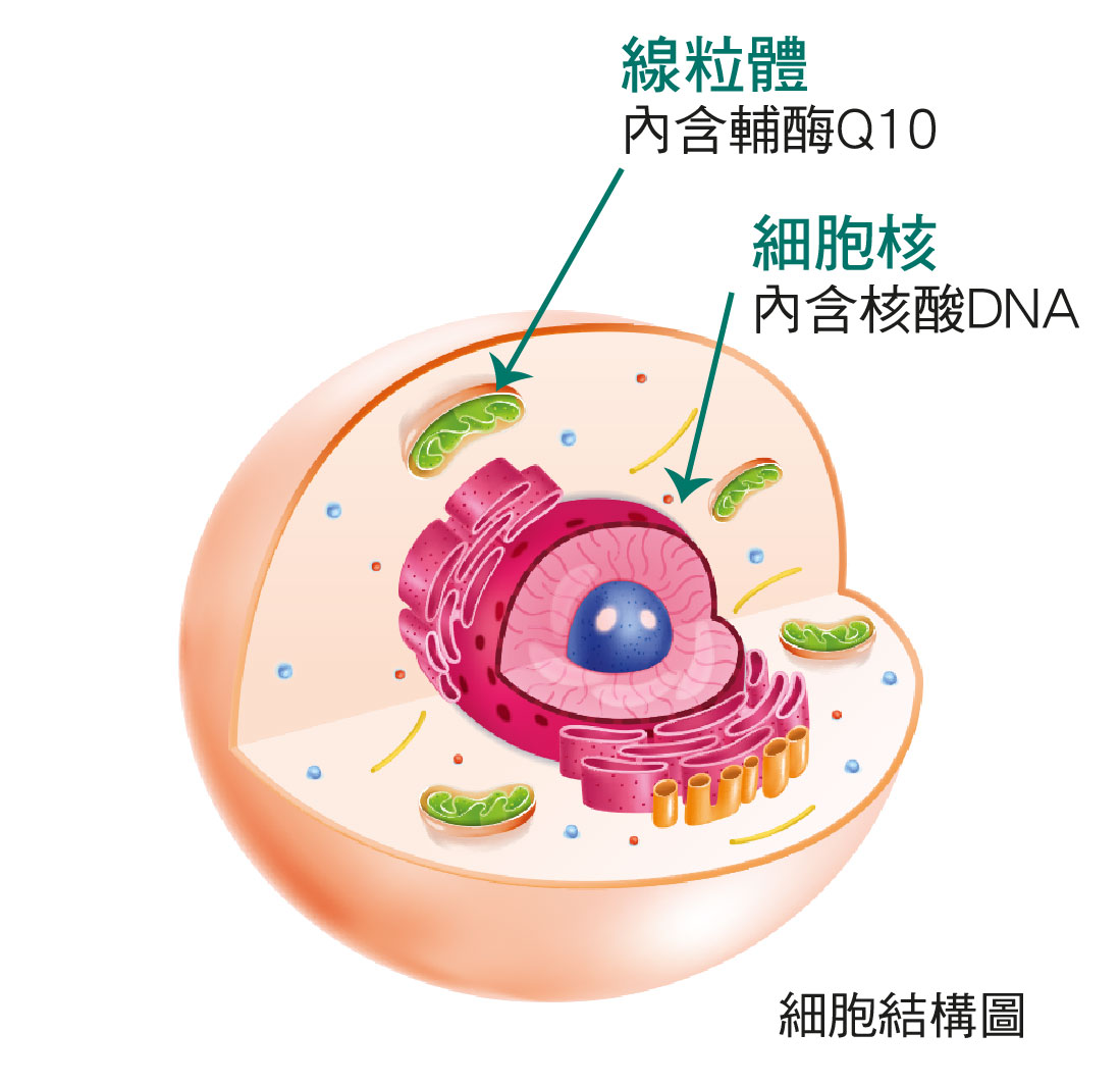 輔酶Q10(Co-enzyme Q10)是細胞中不可或缺的營養素,線粒體(細胞能量工廠)負責供養細胞並製造身體所需95%能量,輔酶Q10等同線粒體燃料,提供能源及補充細胞動力。